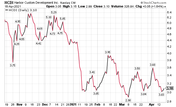 “I’d start with the ones that are either too new to be heavily weighted in institutional portfolios or have lagged their peers,” Kramer said. “My top name in both categories is Harbor Custom Development Inc. (NASDAQ:HCDI), which went public in August and has quickly become one of my favorites.”