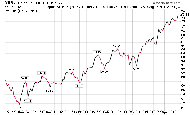 One way to gain exposure in the sector is by investing in SPDR S&P Homebuilders (XHB), a dividend-paying exchange-traded fund (ETF) that is up about 28.16% so far this year after zooming 129.15% during the past 12 months, said Carlson, who added he favors investing in a fund rather than individual home builder stocks. SPDR S&P Homebuilders is intended to provide investment results that correspond generally to the total return of the S&P Homebuilders Select Industry Index, before fees and expenses.