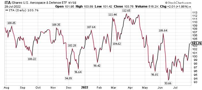 ITA rose 9.39% in 2021 and is down 3.38% so far in 2022. The fund’s top holdings consist of Raytheon, Lockheed Martin, Boeing, Northrop Grumman and Howmet Aerospace (NYSE: HWM).