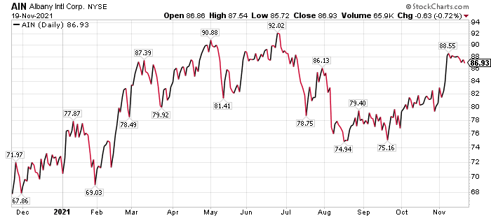 Albany International Corp., (NYSE: AIN), headquartered in Rochester, New Hampshire, operates 23 facilities in 11 countries, as well as employs approximately 4,000 people worldwide. The company is a global advanced textiles and materials processor that also serves the defense industry.