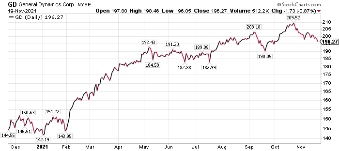 Reston, Virginia-based General Dynamics (NYSE: GD), the world’s third-largest defense and aerospace company, is a recommendation of veteran stock picker Jim Woods. A former U.S. Army paratrooper, Woods chose General Dynamics as one of the stocks in his Intelligence Report newsletter’s Income Multipliers Portfolio. Woods also leads the Successful Investing newsletter, as well as the Bullseye Stock Trader advisory service.