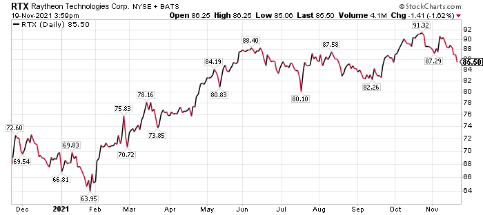 Even so, Raytheon’s share price has been in a trading range since June, Carlson commented. The stock also is recommended by BofA.