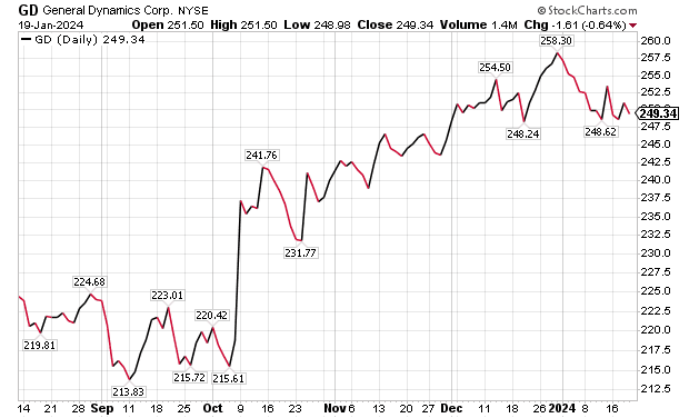Reston, Virginia-based General Dynamics (NYSE: GD) is an aerospace stock that DiPalma recommends with an “outperform” rating. The company’s technology division has experienced bookings momentum over the past two quarters that should allow it to continue to notch solid growth despite the loss of a computer hardware system (CHS-6) contract with the U.S. Army last September, DiPalma wrote in a Jan. 11 research note. At the same time, the Gulfstream G700 certification slipped out of the fourth quarter and will pressure fourth-quarter earnings, he continued.