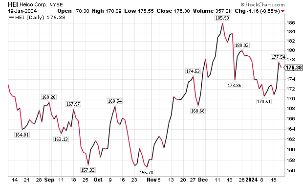 However, Heico’s management previously had expressed an interest in reducing its debt and not focusing on acquisitions within its Flight Support Group, DiPalma wrote in a Jan. 16 research note. The valuation of Heico’s shares that trade at 42 times forward year earnings is below its five-year average of 48 times but at a premium to its peers, DiPalma pointed out.