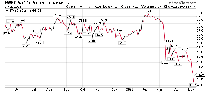 The bank’s stock has fallen along with its banking peers, Connell added. Year to date, East West Bancorp, the holding company of East West Bank, is down 28.59%, Connell said. In the last 12 months, it’s slid 31.46%, while slipping 8.82% on Tuesday, May 2, she continued.