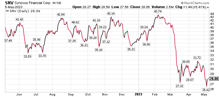 Of course, the banking sector has suffered since then amid high inflation and increased rates, so investors need to be cautious. Risks faced by SNV include potentially slowing economic growth, as well as a possible reduced takeout price compared to $40 price range where the stock had been trading in February.