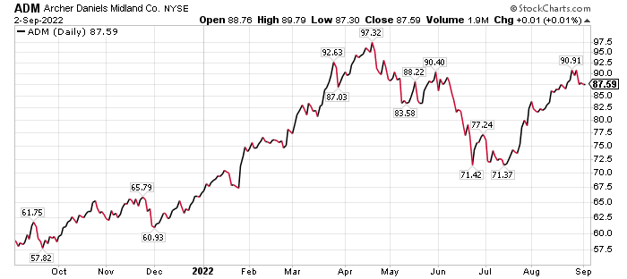 Chicago-based Archer Daniels Midland (ADM) is one of the world’s largest processors of food and beverage ingredients. The dividend-paying stock also has a smaller business focused on nutrition for animals and people.