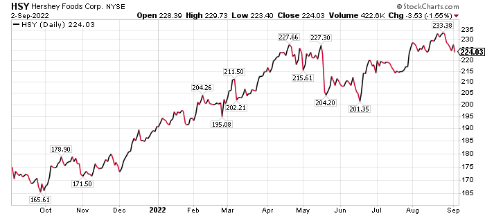 “Last quarter, HSY saw strong earnings per share (EPS) growth of 22% year over year, and I expect the company to deliver an even tastier result when they report earnings again in late October,” Woods said. “The reason being is that confection sales are up of late, and I think it’s because many consumers are taking refuge in the small pleasures in life where they can, especially considering the dual pinch of rising inflation and soaring gas prices.”