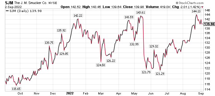 BofA’s $160 price objective on SJM, up recently from $155, is based on 17.5x of the investment firm’s 2023 EPS estimate. The valuation multiple is at a discount to overall peer group average of 19x, but more in line with centers store packaged food peers that is warranted as SJM executes against its fiscal year 2023 plan, BofA continued.