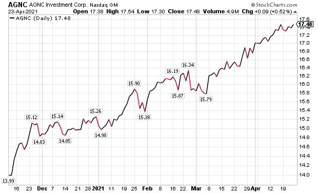The comparative underperformance of AGNC to its sector may be an indicator that further upside for the REIT remains ahead. A regression to the mean describes a phenomenon that applies to stocks when a future price will be closer to the average than a previous outlier.