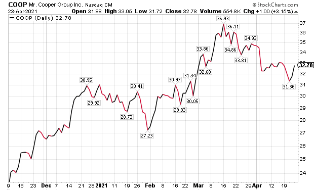 These new residential mortgage loans are made through a direct-to-consumer channel, which provides refinance options for existing customers by purchasing or originating loans from mortgage bankers and brokers, Woods explained. When running Bullseye Stock Trader criteria screens on COOP, Woods found strong earnings growth, with the company’s estimated earnings per share (EPS) rising 112% in 2020 and its first-quarter EPS growth expected by consensus analysts’ projections to near 230% year over year.