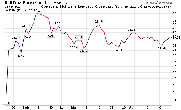 Potential positive signs entail strong housing fundamentals that support demand; continued net migration to markets where DFH has a presence; improving margins and return metrics; a potential easing in home price appreciation and/or pullback in interest rates. Dream Finder Home completed its initial public offering (IPO) on Jan. 21 by selling 9.6 million shares of Class A common stock at $13 per share. With a closing price of $22.14 on April 21, the stock is up 70.31% since it went public three months ago.