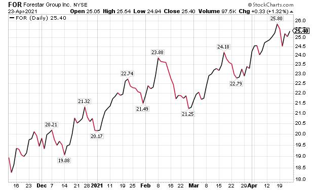 However, BoA noted Forestar Group carries risk such as potential inability to achieve significant growth and profit opportunities; substantial debt and possible equity financing; general cyclicality of new single-family home construction; a fiercely competitive industry for land; a historical reluctance of investors to view housing stocks as long-term investments; and tight labor markets. Plus, Forester Group has a potential forward consensus P/E estimate from analysts at a rather lofty 48.54.