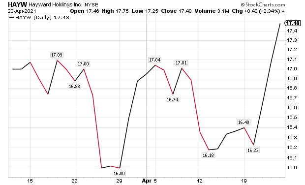 On March 11, Hayward Holdings priced an initial public offering of 40,277,778 shares for its common stock, with 22,200,000 shares offered by Hayward and 18,077,778 shares supplied by existing stockholders. The initial public offering price came in at the $17.00 low-end price of its range that had a top end of $19.00 per share. Since then, the stock has fallen 4.53%, just a bit more than its sector’s drop of 4.49%.