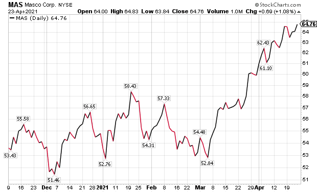 Masco’s share price has jumped 8.68% in the past three months, 15.86% so far this year and 63.67% in the past 12 months, compared to its sector rising 10.62%, 20.64% and 134.65%, respectively. Masco offers a current dividend yield of 0.86%.
