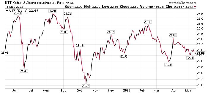 The leading sectors in UTF were electric utilities (32%), corporate bonds (13%), midstream energy (10%), toll roads (7%), and freight rail (7%). The fund’s recent distribution yield reached 8.03%, with a small portion of the 2023 distributions consisting of return of capital. UTF lost 9.51% in 2022 and is down 1.01% so far in 2023.
