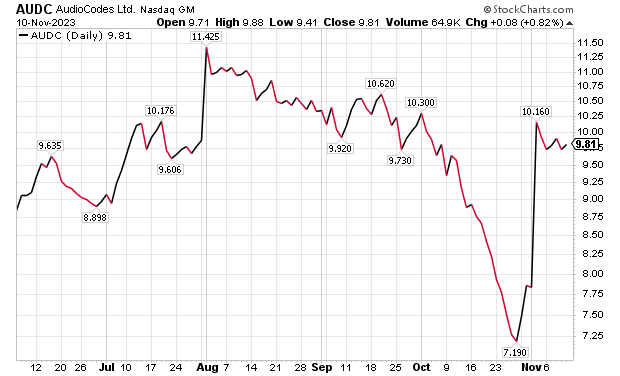 Israel’s AudioCodes Ltd. (NASDAQ: AUDC) enables enables enterprises to manage voice, video, and data communications via a cloud-based service. Unified Communications as a Service (UCaaS), also known as UC, provides session border controllers, media gateways and other infrastructure to ensure smooth and secure communication. In third quarter 2023 ended Sept. 30, AudioCodes’ revenues rose 2.6% sequentially to $61.6 million and climbed 4% from first quarter 2023.