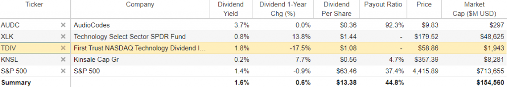 TDIV recently had 84 holdings, and its 10 largest positions accounted for 53.7% of its assets. The biggest weightings recently were Microsoft (NASDAQ:MSFT), IBM (NYSE: IBM) and Broadcom (NASDAQ: AGVO).