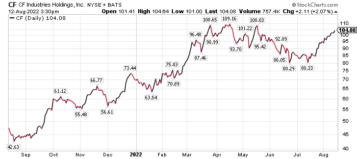 Another fan of CF Industries Holdings is Mark Skousen, PhD, who recently recommended it profitably in his Five Star Trader advisory service. Skousen follows commodities closely as the head of the Forecasts & Strategies investment newsletter, as well as additional trading services such as Fast Money Alert, Home Run Trader, Five Star Trader and TNT Trader.