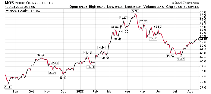 Russia is a big producer of potash, a key crop nutrient that is used in agricultural production. Robust growth in the company’s year-over-year earnings per share (EPS) and rising prices for fertilizer from constricted supply out of Russia led to a surge in the value of MOS call options that recently were recommended by Jim Woods in his High Velocity Options trading service.