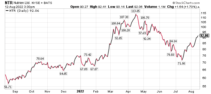 Nutrien Ltd. (NYSE: NTR), a dividend-paying Canadian fertilizer company based in Saskatoon, Saskatchewan, is the largest producer of potash and the third-largest maker of nitrogen fertilizer in the world. Its management said Nutrien will boost potash production if supply problems worsen in Russia and Belarus, the world’s second- and third-largest potash-producing countries, respectively, after Canada.