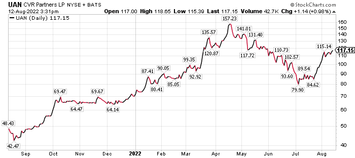 CVR Partners LP (NYSE: UAN), of Sugar Land, Texas, manufactures and provides nitrogen fertilizer products as a subsidiary of Coffeyville Resources, a unit of CVR Energy Inc. UAN, another recommendation of Perry, offers a 16.4% dividend yield that should entice income seekers.