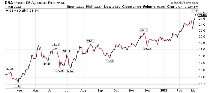 The fund is up 6.07% in the last month and 10.58% for the year to date. DBA is not a dividend payer but its recent rise shows that agricultural stocks are climbing, even as many other sectors are falling since Feb. 24 when Russia launched a full-fledged attack of Ukraine.