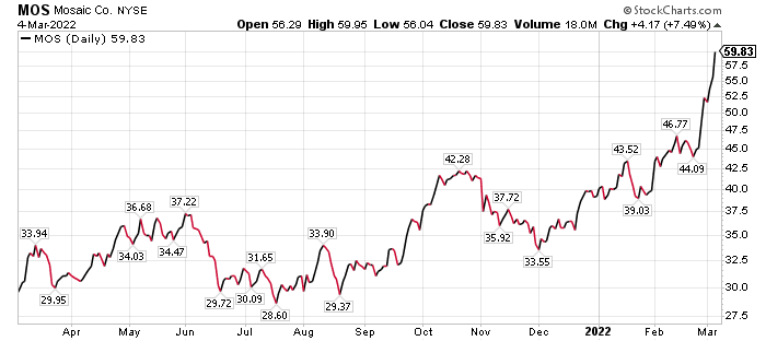 The company’s year-over-year earnings per share (EPS) growth jumped about 242%. That report, along with the price pressure in the industry from constricted supply out of Russia, has resulted in a big surge in the value of MOS call options that recently were recommended by Jim Woods in his High Velocity Options trading service.