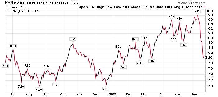 Kayne Anderson Energy Infrastructure Company (NYSE: KYN), a Houston-based closed ended equity mutual fund launched and managed by KA Fund Advisors, LLC., provides the largest payout of the four inflation-shelter investments to buy. KYN offers a current dividend yield of 10% and is a recommendation of Bryan Perry, a high-income aficionado who is a veteran of Wall Street firms and the editor of the Cash Machine investment newsletter.