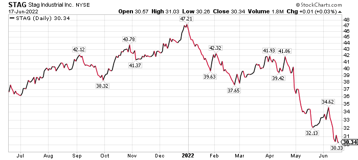 Connell told me one of her favorite REITs involved in distribution centers and warehouses is Boston-based Stag Industrial Inc. (STAG). A key reason is that distribution centers became more “imperative” during the pandemic due to a shift from brick-and-mortar retailers to online shopping.