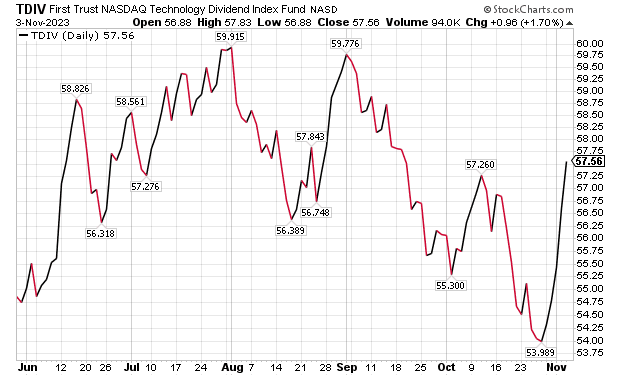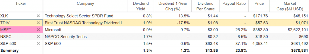 TDIV recently had 84 holdings, and its 10 largest positions accounted for 53.7% of its assets. The biggest weightings recently were Microsoft (NASDAQ:MSFT), IBM (NYSE: IBM) and Broadcom (NASDAQ: AGVO). The stock currently offers a 1.93% dividend yield.