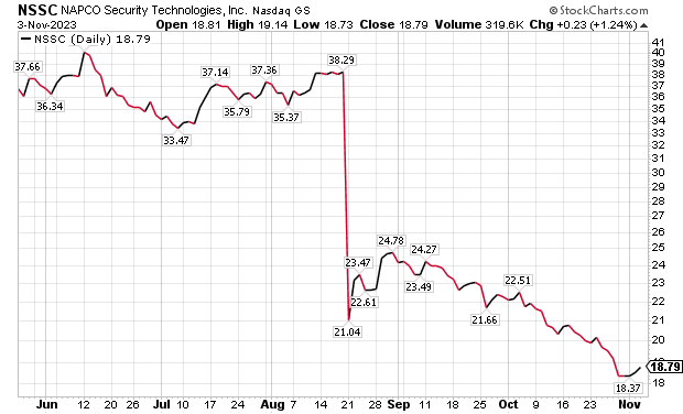 Fiscal first quarter 2024 results, for the three-month period ended Sept. 30, are scheduled to be released on Monday, Nov. 6, prior to the market’s open. NAPCO is down 31.94% so far this year through Nov. 2.