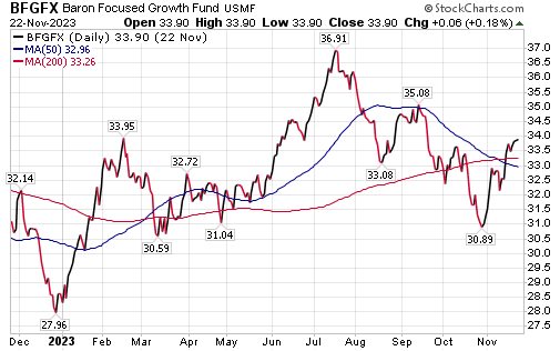 The Baron Focused Growth Fund (BFGFX), managed by Ron and David Baron, offers Tesla and SpaceX as its two largest holdings, with 11.3% and 8.7% of the mutual fund’s assets, respectively. BFGFX is up 16.18% through Sept. 30, when Baron Capital reported the latest results.