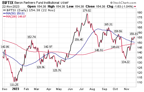 The Baron Partners Fund (BPTIX), with Ron and Michael Baron as the portfolio managers, also has Tesla and SpaceX as its two biggest holdings. Tesla accounts for 36.2% of the fund’s assets, while SpaceX has attracted 9.7%. BPTIX is up 32.36%, as of the most recent data on Sept. 30.