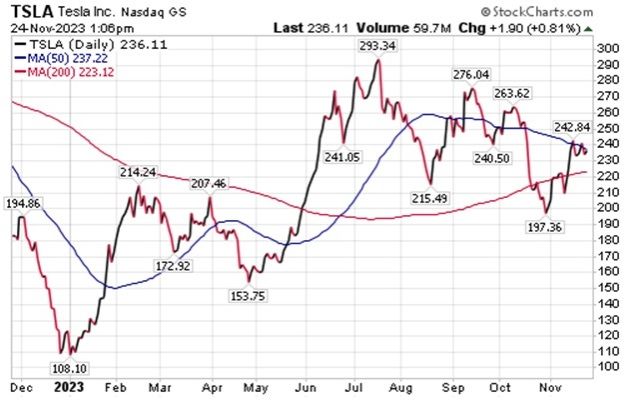 Investors in Tesla need to be prepared for volatility. The trading service’s most recent recommendation in the electric vehicle company stopped out at a loss of less than 20%. Those stop losses are a safeguard in Fast Money Alert to avoid big drops, while allowing for potentially massive gains like the returns on the Tesla stock and options early in March 2023.