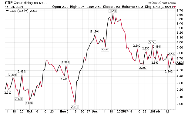 Coeur Mining operates four wholly owned operations: the Palmarejo gold-silver complex in Mexico, the Rochester silver-gold mine in Nevada, the Kensington gold mine in Alaska and the Wharf gold mine in South Dakota. Plus, Coeur Mining owns the Silvertip silver-zinc-lead exploration project in British Columbia. A lesson about the volatility of the stock was shown on Tuesday, Feb. 13, when its share price plunged 8.3%, falling 24 cents a share to $2.54.
