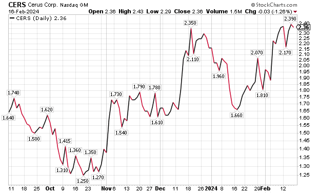 Another double-digit percentage trade came from Cerus Corp. (NASDAQ: CERS), a biotechnology company in Concord, California. The stock jumped 10.23% in three days, leading Johnson to advise his subscribers to take their profits.