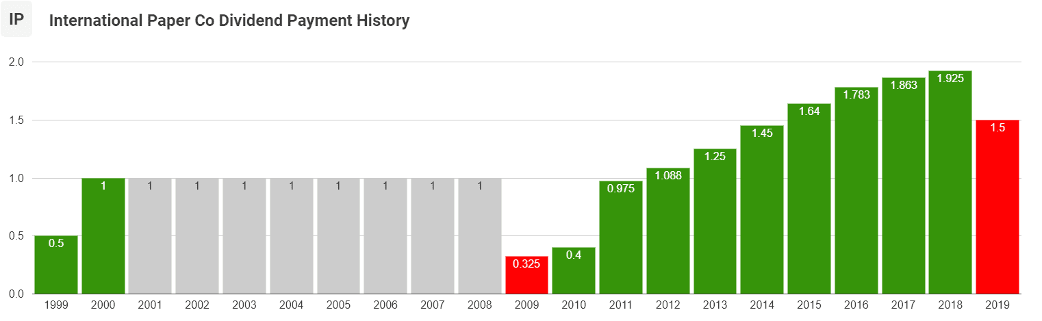 Immediately after the 2009 dividend cut, the International Paper Company began increasing its annual dividend payout distributions. Within just two years, the company’s annual dividend payout came back to within 3% of the annual payout amount that was distributed before the 2009 cut.