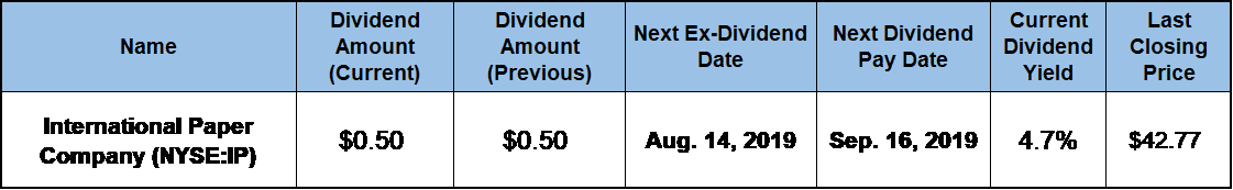 Therefore, after conducting their own due diligence, investors who are confident in International Paper’s share price rebound might consider taking a long position before the next ex-dividend date on July 30, 2019. While waiting for the share price to rebound, these investors can enjoy collecting dividend income payouts that yield 4.7%. The company will deliver the next round of these dividend income distributions on the September 16, 2019, pay date.