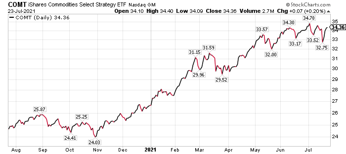 COMT invests in most commodities using futures contracts. The fund has gained 9.30% in the last three months and 28.27% for the year to date.