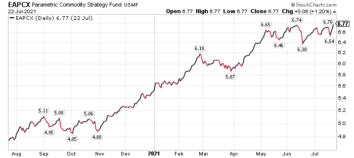 “Another good choice is Parametric Commodity Strategy (EAPCX), an open-end mutual fund,” Carlson said. “This fund also takes most of its commodity positions through futures contracts. The fund’s benchmark is the Bloomberg Commodity Total Return Index, which isn’t as heavily weighted in energy as the GSCI.”