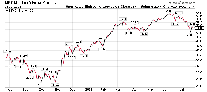 Revenues at Marathon are forecast to rise by 23% to $85 billion in 2021 with earnings of $1.03 per share estimated to soar by 221% to $3.31 in 2022, Perry said. The stock traded at $64.84 in early June and is testing its 200-day moving average around $50, offering a dividend yield of 4.5%, Perry continued.