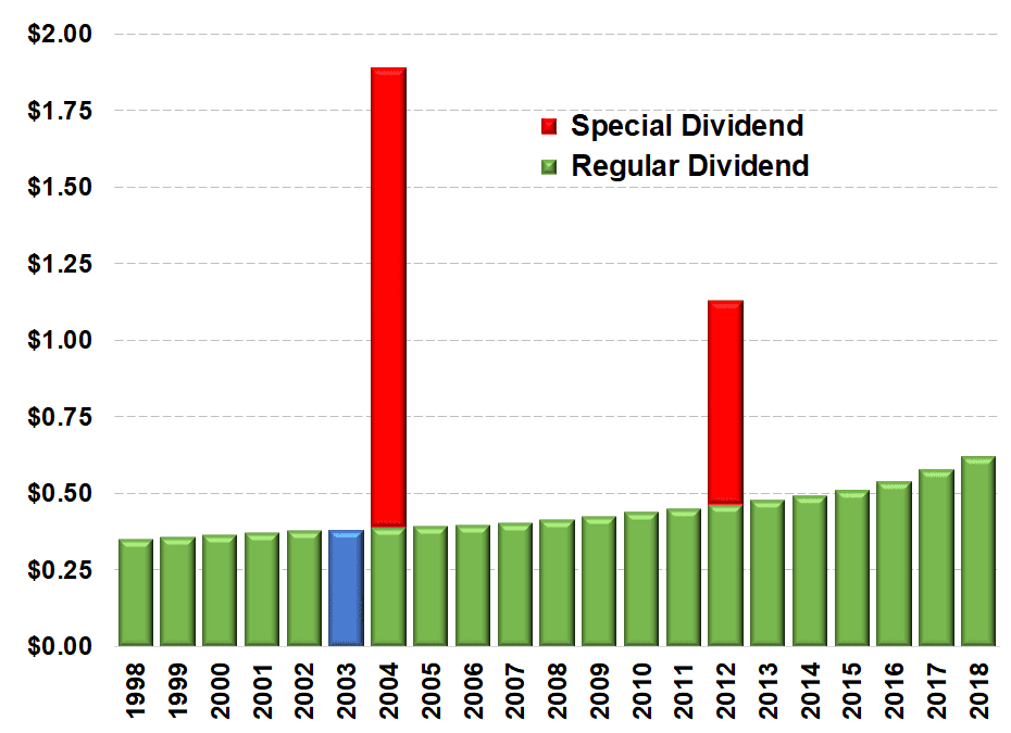 A better indicator of the company’s dividend performance would be the growth rate over the past several years. Over the past 14 consecutive years, the company grew its annual dividend. distribution at an average growth rate of 3.3% per year. Since the current consecutive annual dividend boosts streak started in 2004, the total annual dividend amount advanced 76% from $0.3899 to the current $0.62 annualized amount in 2018