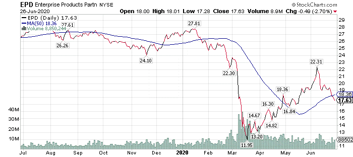 Even though the share price of EPD has pulled back 20.98% between June 8 and June 16, it still offers a quarterly distribution of 67 cents per unit. However, 2020 is the year in more than a decade that EPD has not raised its dividend.