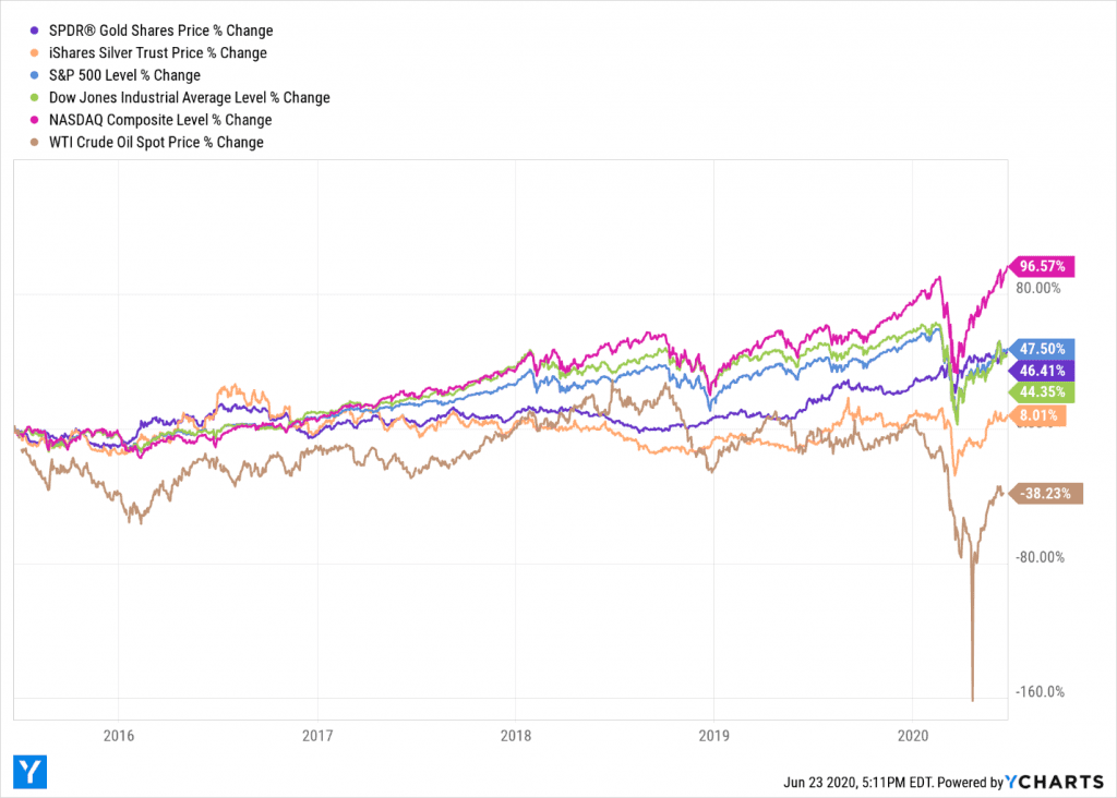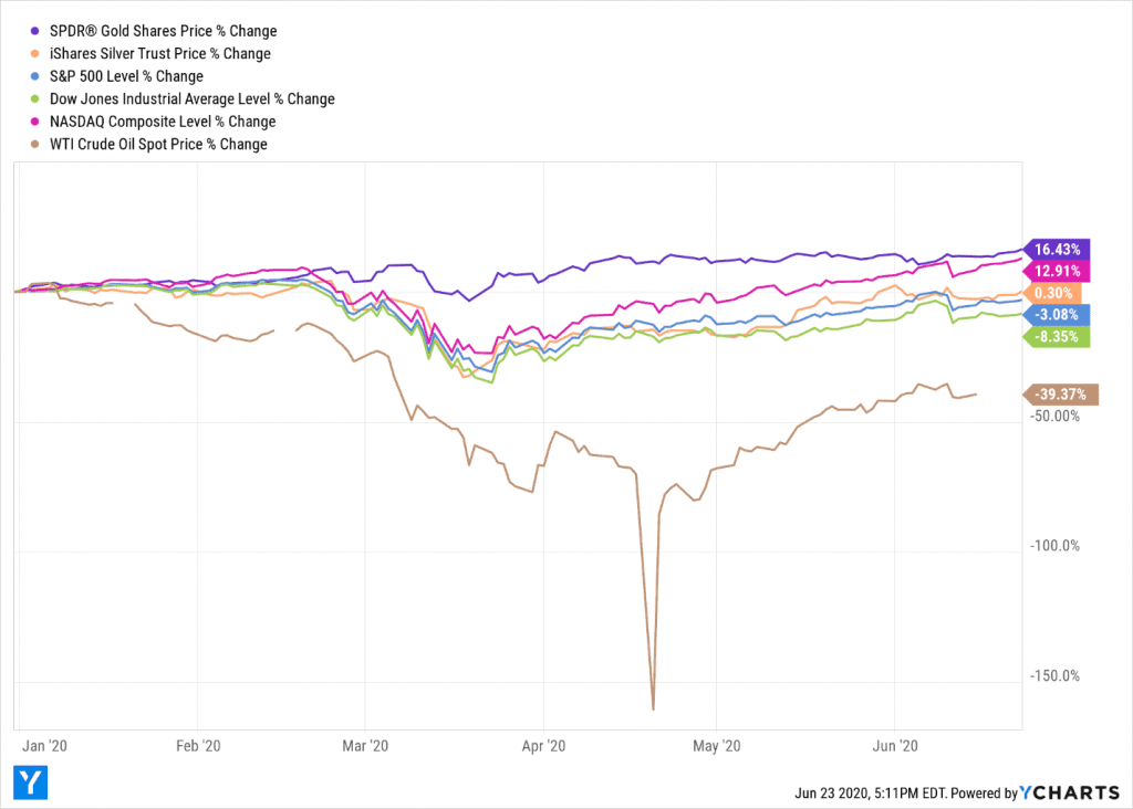 Oil, based on the WTI Crude Oil Spot Price, slid 39.37 since the start of 2020, trailing even the money-losing Dow Jones Industrial Average, down 8.35%, and the S&P 500, dipping 3.08%. Gold, using SPDR Gold as a proxy, rose 16.43% so far in 2020 through June 23, topping the NASDAQ Composite, up 12.91%, and the iShares Silver Trust, nosing ahead 0.30%.