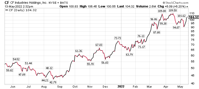 Wheat, corn and soybean prices jumped upon the full revelation of the Russian attack of Ukraine, Perry continued. One of the biggest winners from pure demand and sanctions will be CF Industries Holdings, Inc. (NYSE: CF), a manufacturer and distributor of agricultural fertilizers that include ammonia. The company, based in the Chicago suburb of Deerfield, Illinois, is facing increased distribution costs, particularly for transportation.