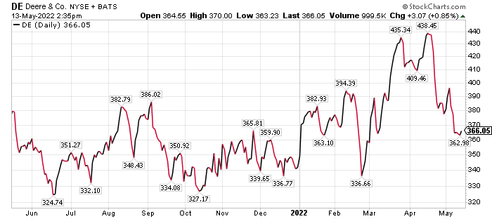 Deere has fallen back more than 15% from its recent high on April 20, so investors might find its current price to be a good entry point, Connell continued.