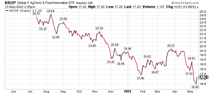 Global X AgTech & Food Innovation ETF (NASDAQ: KROP) looks interesting as a possible buy, Connell continued. KROP is an agricultural technology ETF.