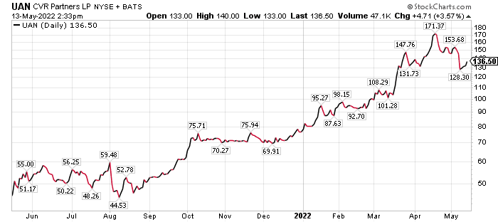 CVR Partners LP (NYSE: UAN), of Sugar Land, Texas, makes and provides nitrogen fertilizer products as a subsidiary of Coffeyville Resources, a unit of CVR Energy Inc. UAN is another of Perry’s four farming picks. Income investors should appreciate the stock’s 9.2% dividend yield.