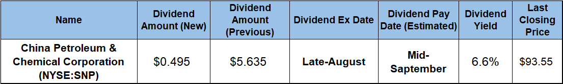 Sinopec has not yet declared an ex-dividend date for its upcoming distribution, but based on its past records, a late August to early September ex-date can be expected. The payout date for the dividend should be sometime in mid-September.